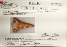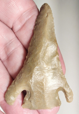 This glossy, swept-wing Lost Lake point has been reworked but still retains its original form and symmetry. The ears are classic and the notches are deep. This piece was found in Prentiss Co., Mississippi and comes with a Dwain Rogers COA. It stands out in any frame.