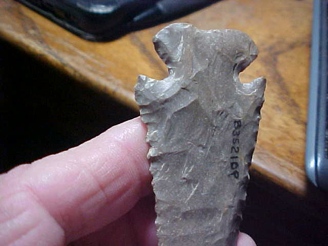 Shipping cost included with the price. on this ex Pesch Collection Dovetail. The auction information for Bill's collection did not indicate if he found or bought the big 3.25" by 1&7/16", ONLY 1/4" thick Early Archaic point there in Fayette County, or if it was it from a dealer he trusted. You now have the history I got with the piece. It's a mottled type of Hornstone, patinated and with a few old nicks and dings to its history (see the tiny impact fracture on the side of the tip, for one, and I note some ancient salvage/ repair to the insides of the Dovetail stem. The barbs, the basal grinding, excellent workmanship. The tip has that needle point of a burin. Authentic, period. I welcome checks or M.O.s but please note I DO NOT take paypal--Roy a.