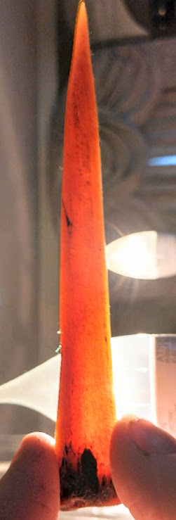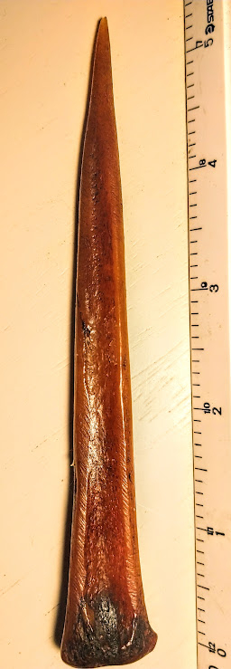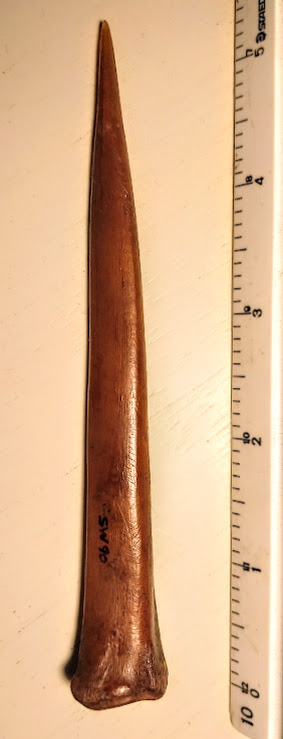 This polished Bone Awl is made from a deer bone. It was found in Val Verde Co., Texas and, along with the other large bone awl just listed, were the 2 best awls in a collection of 28. This particular awl is unique in that it must have been used to work fatty hides as it absorbed oil to the point that it has become almost translucent with age. A truly unique item for those who collect only the finest!