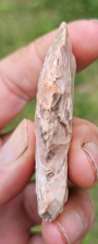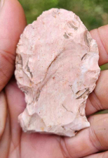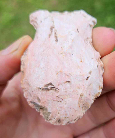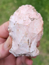 Very neat tool, likely a small hoe. Well made from beautiful waxy pink burlington chert. Found in Southern Illinois and measures 2 3/8 inches long by 1 1/2 inches wide. Interesting small for your collection.