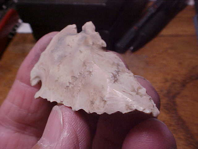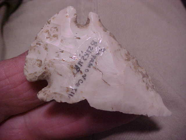 Sangamon county, Illinois (Springfield area), Burlington Chert2&1/8" by 1&7/16, 3/8" thickness, authentic in every detail--the Dove must have started much longer as those beveled edges are steep beveled--that tells you a lot of blade was lost in multiple sharpenings. Nice piece, great basal edge grinding. Shipping is $6.00, and please note that I do NOT use paypal--I welcome checks, cash, or money orders, though--Roy A.