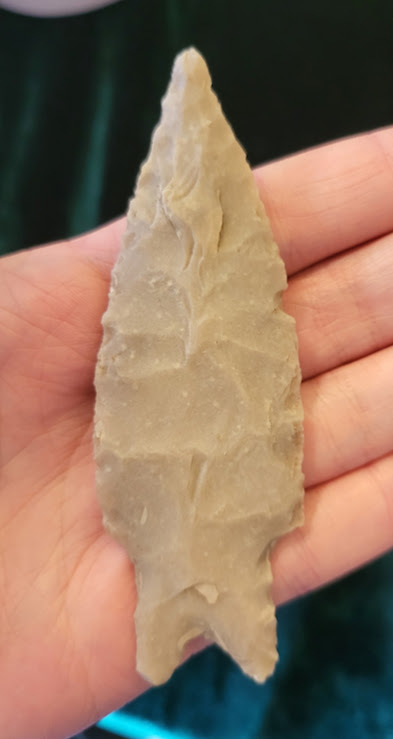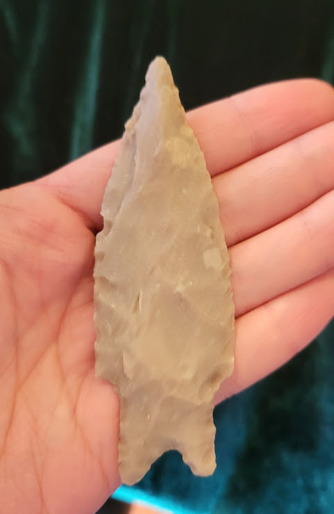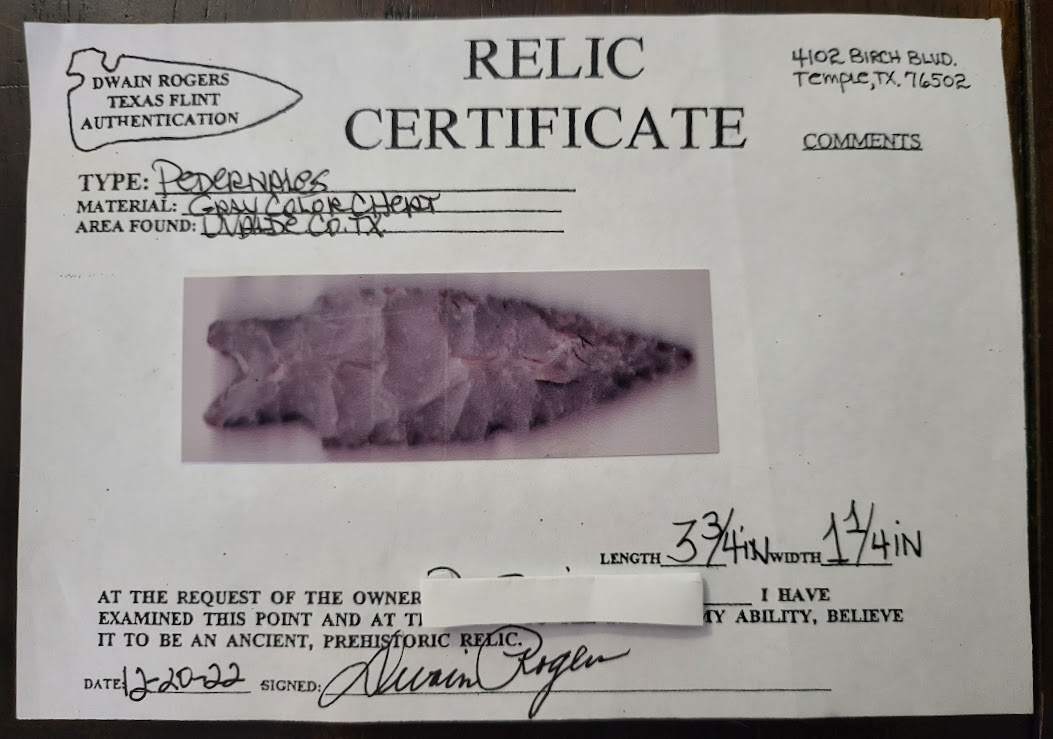 This Pedernales point is made of gray chert and was found in Uvalde County, Texas. It comes with a COA from Dwain Rogers.