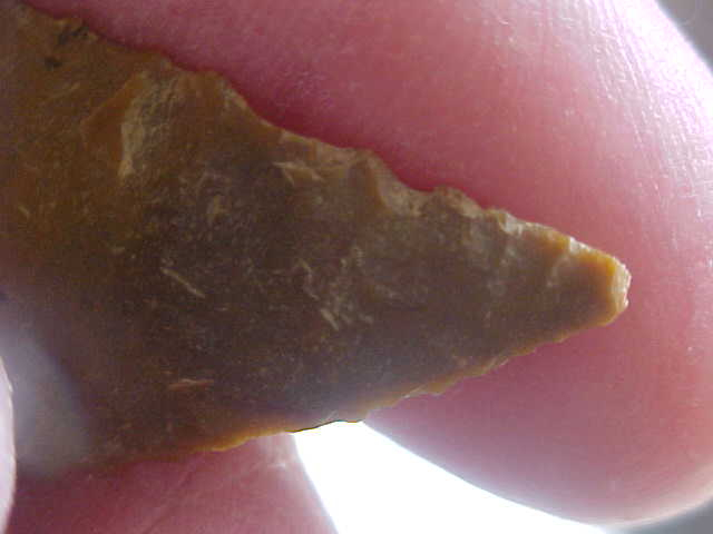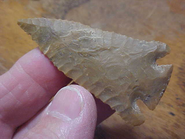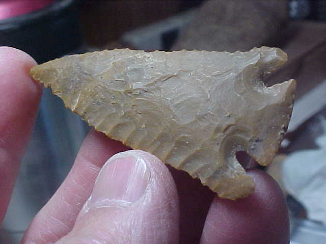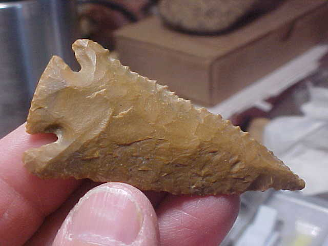 The patina is pure creek stain--if there WAS a modern-made chip the dark gray of the Indiana Hornstone would show--I can't find so much as a tiny chip that's modern. I type the piece as a Cornernotched Pinetree, but if you see a Cornernotched Kirk, I can understand that. There is enough basal edge grinding that I'm comfortable with the Pinetree designation--a Kirk would have very little (usually) basal grinding. There are always exceptions--what's not a question on this Knox County, Indiana, find is the authenticity--lifetime guaranteed real in every detail. Length is fractionally over 2&1/2" by 1&5/16"--thinness is just over 1/4" by my caliper. Thin, superbly pressure flaked, much of the edge work parallel oblique, those superb angled flakes the Early Archaic people specialized in.. The only thing I can characterize as 'damage' is a very slight wear on the (formerly) needle tip--and a flake below the tip that looks like it exfoliated in the thousands of years of freeze-thaw the flint went through--close up photo (in sunlight) shows in detail. I pay the shipping cost, nothing additional. I welcome checks or money orders, but please note I do not use paypal--Roy A.
