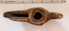 The lamp would be filled with oil in the round hole on the top near the handle and a wick would be placed in the long narrow slot. The 2 chambers are connected at their base. As the oil burned down, additional oil would be added in the round hole where it would enter the wick chamber from below to be burned.