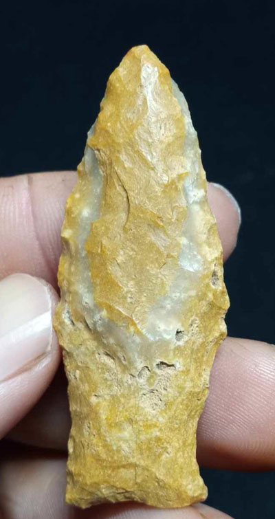 Fine Bajada/Jay from Northern Colorado. Great made piece for the pitty material which is niobrara jasper. Niobrara jasper which comes from Nebraska, is known for having pits and pockets that often give way to broken points. However, the smart individual carefully worked around a pit near the tip and did well. Great point that tells a story, work with what the good lord gave ya haha. Measures 2 1/4 inches long.