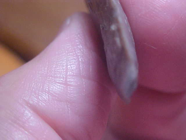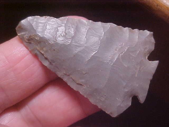 Out of a farm estate in Clark County, Illinois, made from Indiana Harrison County-type Hornstone, not quite to 2&1/8" by 1&3/8"--thickness is very slightly over 1/4" as the basal hafting area, thins as you go up the blade. The base if the Decatur is the "Fractured Base" type with the edge showing a very thin flake removed from each corner--the flakes meet in the center with the 'fingernail catch point. The base was then heavily ground. Both wings are intact, and show another Decatur knapping trick: they're cut-away instead of down-pointed--a "Clipped wing". There was a slightly more pointed tip originally, but there is a small (and Early Archaic made) salvage to the tip. The close up photo should show how the tip was angled. It's difficult to describe, but this is NOT a break, the 7500BP hunter/ knapper was working with the bevel on each blade side, and also working with a very thin blade to begin with. So he didn't need to narrow the entire blade, this was his 'trick'--it left a point to the end, just not a very sharp point. Every detail of the piece is lifetime guaranteed authentic, period. Shipping is $8.00, and I welcome checks, cash, or M.O.s. Please note my store does not use paypal--Roy A.