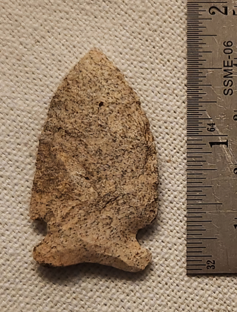 This is a very well made Turin point made out of a fossil chert. The chert has some nice oolites in the matrix.The base is ground across the proximal edges on up into the notches. This one is very well made and it just has a great overall look. eliptical cross section, excrvate lateral blade edges, concave base . A fine early archaic point. Upper midwest ex Caruthers. Guaranteed authentic. Shipping is $5.00 first class mail.