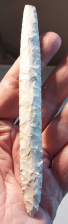 This is an extremely rare Paleo drill that was found in the same layer with Clovis points. The drill was found in Central America and comes with a Roy Motley COA. Mr. Motley was dubious about this piece since it was his opinion that drill forms evolved later historically. However, after close examination, he concurred that this piece was indeed Paleo in age. Approximately 1/3rd of an inch was broken off one end of the drill in ancient times and has the patination over the break to support this.