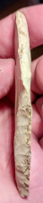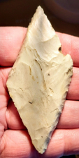 This is a very nice example of a symmetrical Harahey knife with alternate beveling on the edges. It was found in Grayson Co., Texas and comes with a Dwain Rogers COA. The slight notch on one side is from a sedimentary inclusion coming out of the material when the blade was sharpened.
