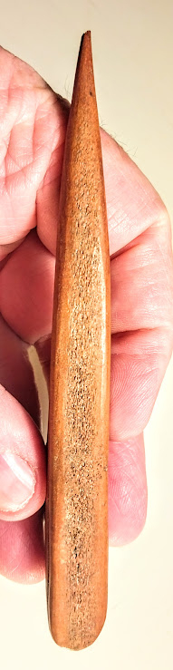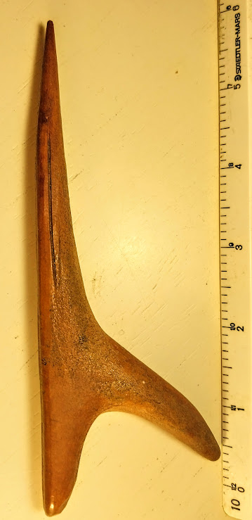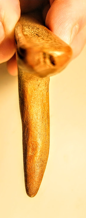 This is the fossilized bone portion of an Eskimo Cod Hook with the pointed end the penetrating hook.part of the rig. It was found on St. Lawrence Island, Alaska.(This is one of 25 pieces obtained in a high-end Eskimo frame, all of which will be listed.)