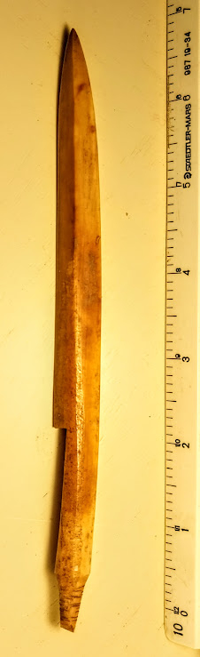This beautiful and functional Eskimo Spear Point is made of an aged fossilized bone with a glossy look. This piece was dug on St. Lawrence Island, Alaska. (This spear is part of a 25-piece, high-end Eskimo frame that I will be listing here.)