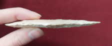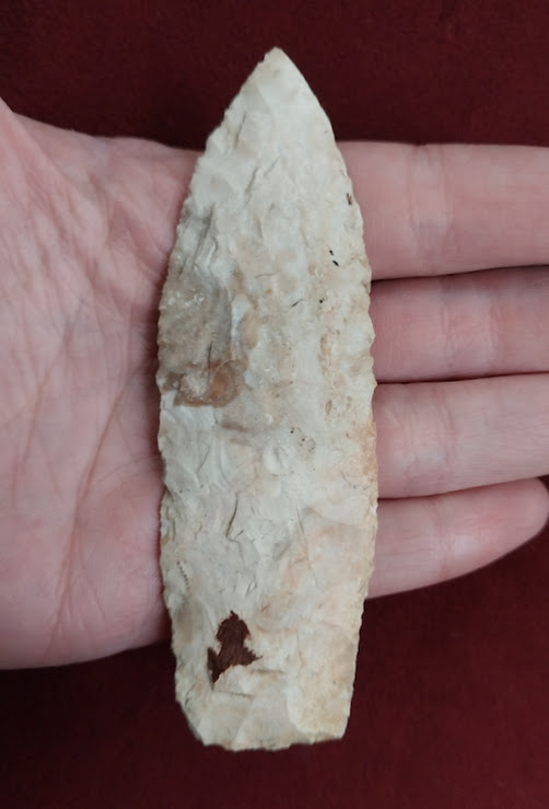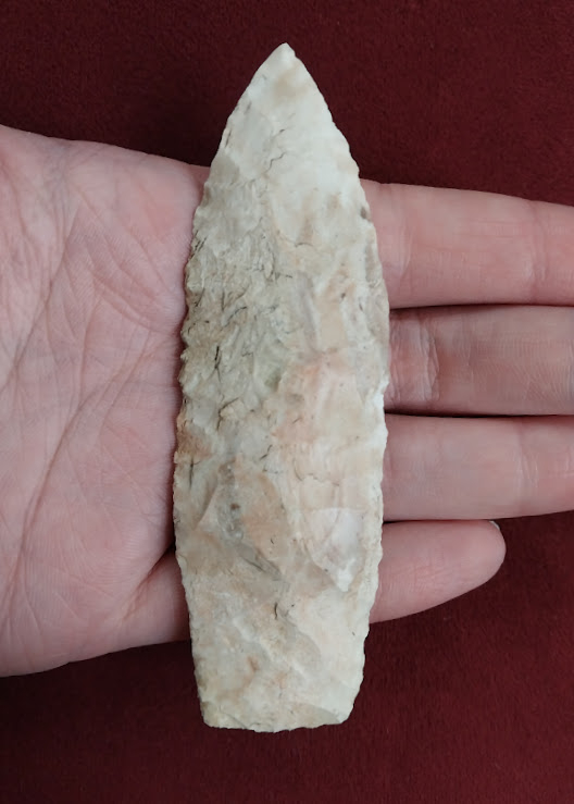 This Kramer is large for its type and is made from pink and white Burlington chert. It was found in Pettis County, Missouri and the point comes with a Dwain Rogers COA.