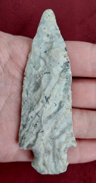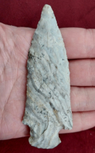 This Etley point is made from Mozarkite and chert with several mineral deposits. The workmanship is exceptional and shows signs of being re-sharpened several times. The Etley was found in Jefferson City, Missouri, and it comes with a Roy Motley COA.