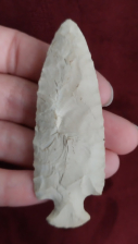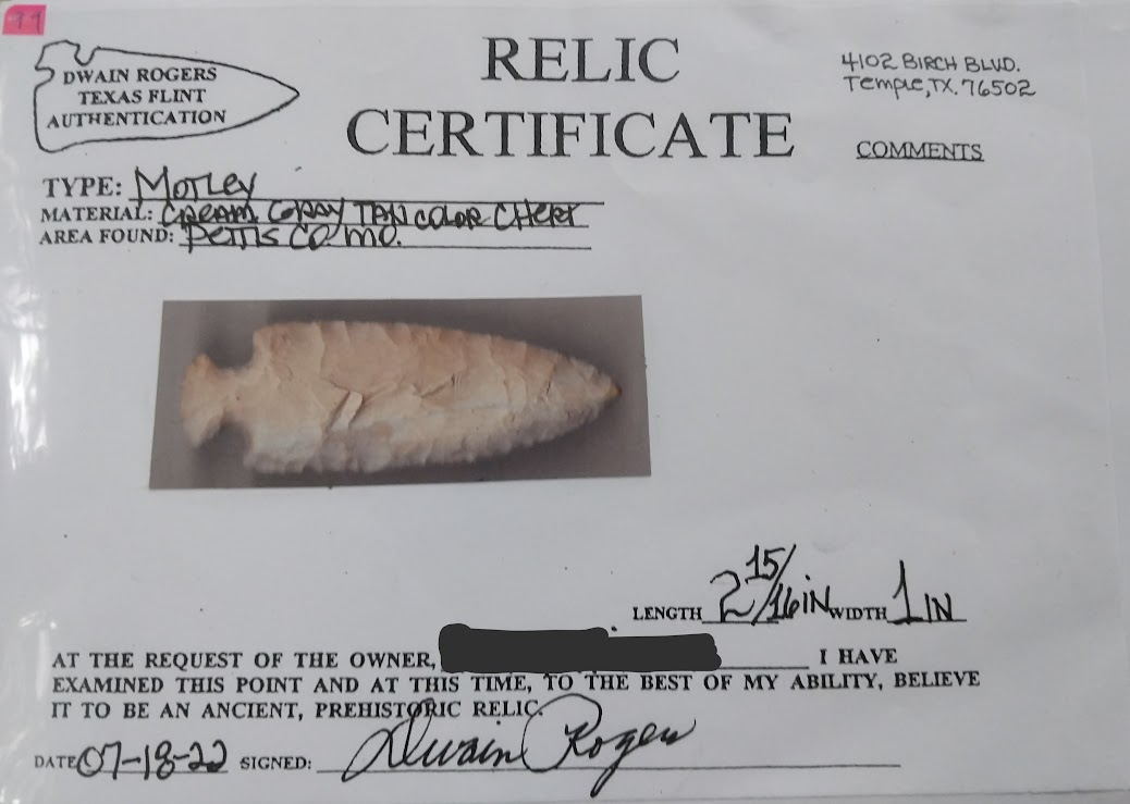 This symmetrical and well-flaked Motley point is made from cream, gray, and tan colored chert. It was found in Pettis County, Missouri and comes with a Dwain Rogers COA.