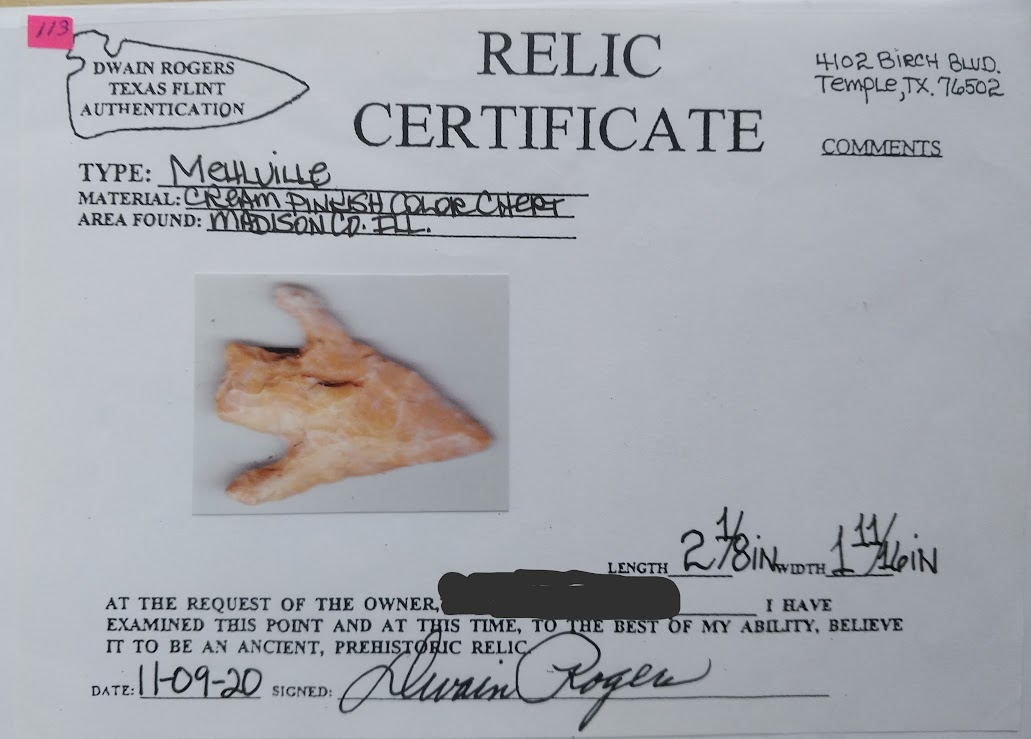 This Mehlville is made from cream and pinkish colored chert. The point was found in Madison County, Illinois, and it comes with a Dwain Rogers COA.