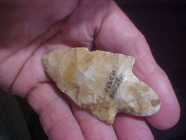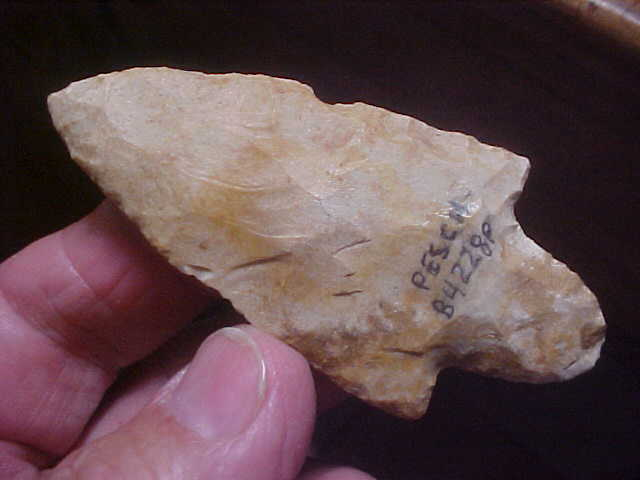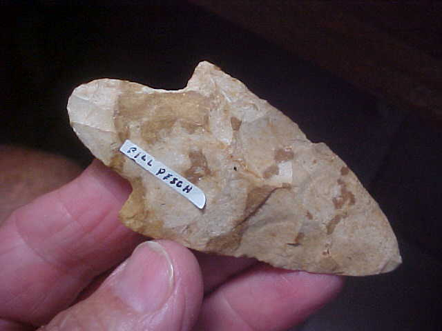 The collector/ finder put his name on the 3&1/16" Adena--Pesch (Bill), along with his catalog number. Much of the collection was marked as Fayette County, so that's where I'd expect the origin of this Woodland Culture find to be. Now, ask me the chert type, that one I'm lost--it MAY be a form of Kaolin Flint, and that's the best I can identify the material. The stem edges show some degree of edge-dulling, but it's light grinding at best. Width is slightly over 1&3/8", max thickness is 3/8", yet with a very thin tip and tail. Patina is excellent, every detail is lifetime guaranteed authentic. Shipping is $8.00, with checks or M.O.s welcomed. Sorry my store doesn't use paypal--Roy A.