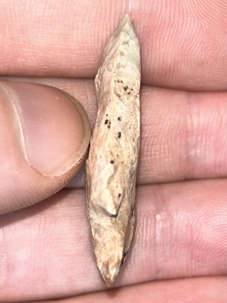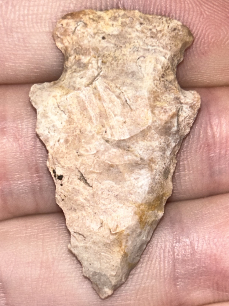 A super nice corner notch found in Knox County, Indiana on 6/2/02. Made from colorful mottled chert with great patina and mineralization. Well made with serrated edges.