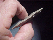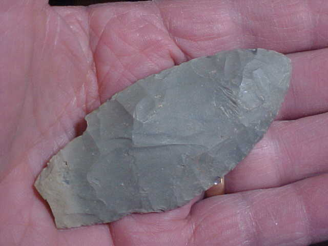 Indiana Spencer County was the origin of this large (3&1/4" by 1&7/16", only slightly over 5/16") Adena--the Ohio River banks produced the piece. For the blade being so long and wide, that's where you appreciate the thinness of the workmanship. The Adena knapper worked from a pretty thin biface, he did his prep-work in making the biface/ preform before notching the shoulders, indenting the basal edge (for stronger hafting)---the piece would sit more secure on a handle if that base was notched, and definitely ground to remove any burrs on the stem. Nice work, great patina, and lifetime guaranteed authentic. Shipping is $8.00, with checks or M.O>s welcomed. Sorry, I do not use paypal--Roy A.