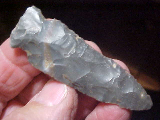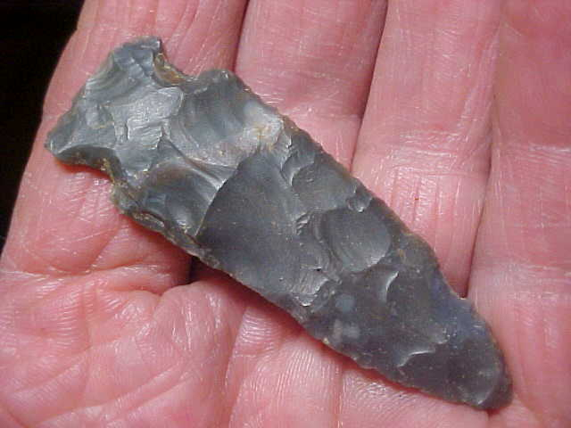 Out of Breckinridge or Ohio County, Kentucky, a Late Late Hopewell Bakers Creek--Lowe Flared point found along the Ohio River--2&9/16" of a very good grade of Sonora Flint--close to 7/8" width and only 1/4" max thickness. This piece is lacking any basal grinding, so that may 'type' it as a Bakers Creek, Lowe points sometimes having moderate basal grinding (in my experience). GREAT color and patina, 100% guaranteed authentic. Shipping is $8.00 with checks or M.O.s welcomed. Sorry, I do not use paypal--Roy A.