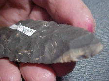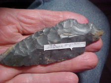 Off a family garden site in Macon County, Illinois--there, you'd expect a white Burlington Chert, but what the garden tiller brought up from that mostly Adena Culture site was dark Excello Flint, very dark blue with creamy inclusion bands. Other pieces ranged to a dull black--classic Excello Flint from the western part of Illinois, if you check on "Illinois Lithic Materials" site (excellent reference if you like studying flint that's found in each state). This long Adena is slightly over 3&7/8" by 1&3/8", and 3/8" or slightly over on the single thickest center ridge spot--as you move away from that slight stack the blade become very, very proportional in thickness, 5/16".The stem is edge-ground, looks like the Adena hunter removed an edge flake on the stem for better fit to the knife's handle--deliberate modification, it's not damage. One lower blade edge shows where the hunter repaired an edge chip from use--he 'cleaned up' a use-made ding. What I'm describing is all, every last chip guaranteed ancient. Off the side of the tip (see close up) is a small gardening-made chip--study the patina difference in that small spot, you'll easily see & understand the overall patina. Shipping is $8.00, checks or M.O.s are the only payments (other than cash) I use & welcome. Questions, please ask. If you have a counter offer, well, please, there is no reason to waste your time,--Roy A.