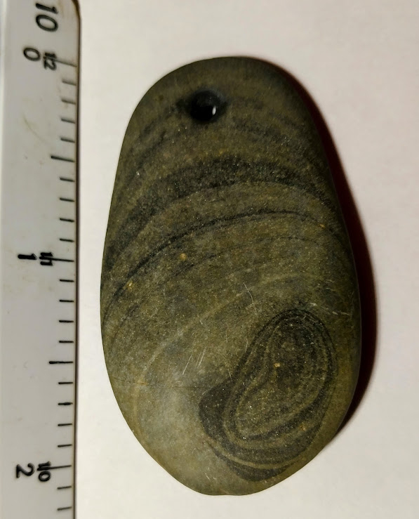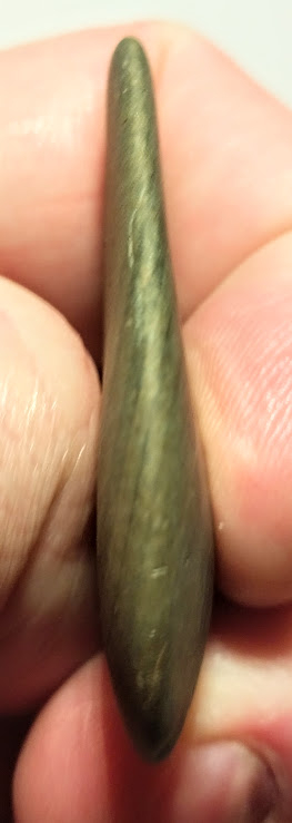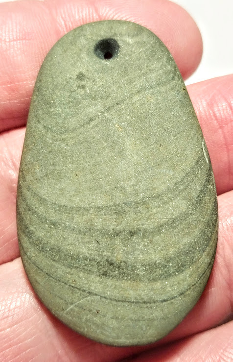 This 1-Hole, Green Slate Pendant is a polished, tear-drop shape. It was found in Clark Co. Indiana not far from the Ohio River. This pendant has a very distinctive design at the bottom which obviously was positioned by its make to attract interest.
