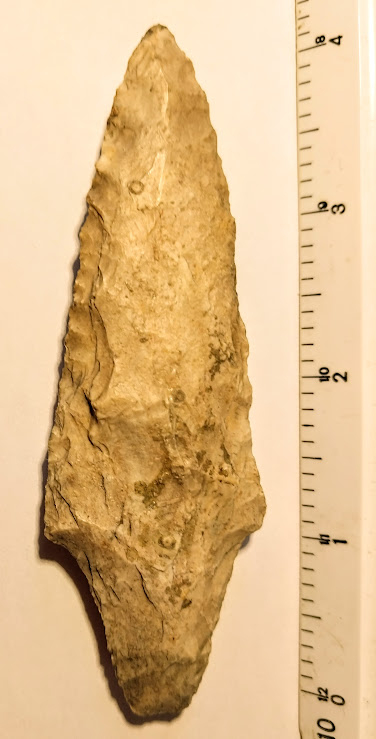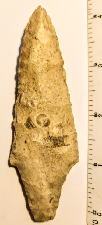 This large Dickson Point has the classic Dixon shape and is made out of fossiliferous chert. It was found in Livingston Co., Kentucky and comes with a Dwain Rogers COA.
