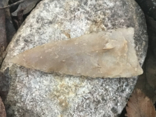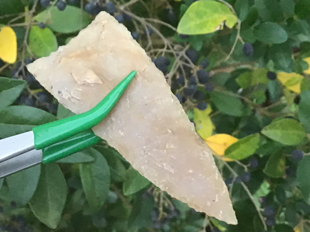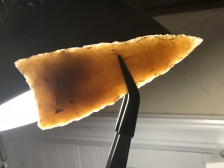 Wow- a very nice and thin Darl blade made of quality translucent material with some absaltum still on the hafting end. Lateral edges show heavy use wear. This is the knife form used by the Darl culture. It has a nice tip with concave base out of Charles Camp's collection. It says central Texas but it sure looks like Gillespie County/Kerr County material. I have the shipping and it comes with a Bill German COA.