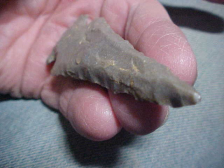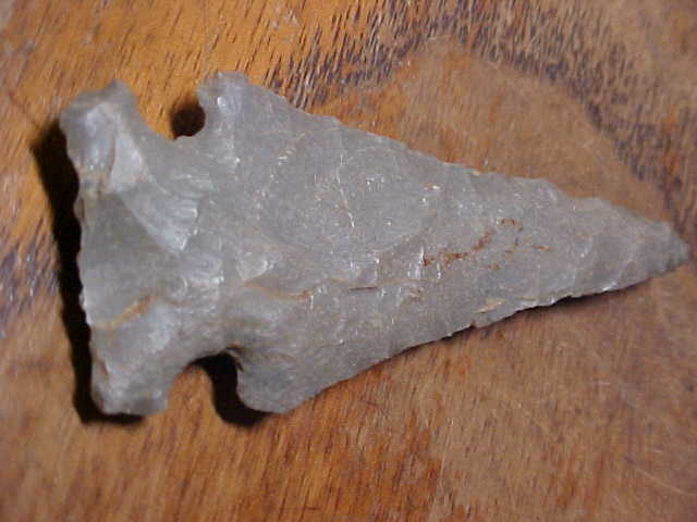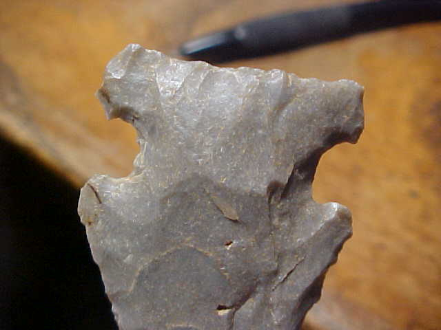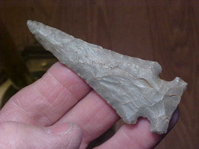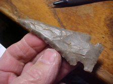 A Warrick County, Indiana, find, nice, very patinated piece of Indiana Harrison County-type Hornstone, 3&1/4" by 1&1/4"--VERY good length, and a max thickness of only 5/16", so the 'balance' is there, too. The width insside the basal notches is closer to the "E-notch form" of the Big Sandy than a standard or even Broad Base Big Sandy--one side, the base is more than a square notch, it hooks upward--that, I's why I type the Early Archaic point as an E-notch. Interesting features in the construction of the piece--the blade is beveled on only one face, both edges; the reverse isn't flat, but it's not far from it. You can take from that that there were a considerable number of ancient sharpenings. One other feature that doesn't seem to have an explanation is that the basal edge is NOT ground--deliberately not ground. Answering that "Why", when it's a rarity for Early Archaic points in general to have ground bases--why isn't this one? The piece is 100% guaranteed authentic, the patina is there, but I can't explain that basal edge--next artifact show I see Jerry Dickey I'll get his thoughts on the subject--I respect his opinions. Shipping is $8.00, checks or M.O>s are welcomed. Sorry, I do not use paypal--Roy A.