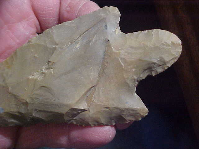 "Kinda big" is sort of an understatement here, I think you'll agree. Length is an outstanding 4&11/16" by 2&1/8". Measured on a 'stack' 1/2" is the single thickest spot. The hornstone type (Harrison County, Indiana, flint) was fractured, a huge flake of flint used for producing this Warrick County, Indiana, find. The flake wasn't a 'perfect biface' as the form & fracture planes show--regardless, the Adena knapper made a respectable knife, used the natural (split nodule) features to his advantage--percussion shaped (finished) edges, a superb stem (may have very slight edge dulling, but I wouldn't describe the stem as "ground". AS the blade is still somewhat sharp-edged I don't think the knife had much of a use life. The finder picked the piece up quite a few decades back as I understand it--wish I knew if he was an early creek hunter as a piece this size isn't generally a field find. Patina is lifetime guaranteed authentic in every detail. $8.00 shipping, checks or M.O.s welcomed. Sorry, I do not use paypal--Roy A.