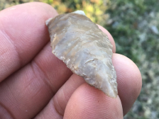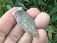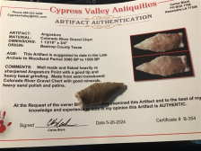 The base is heavily ground with a material color change. It has a nice median ridge on both sides made of Colorado River Gravel. Semi-translucent, it has fine flaking and comes with a Carlos Black coa. I have the shipping.