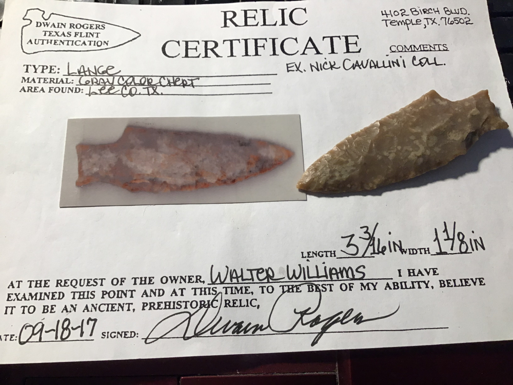 Beautiful and quality gray colored Edwards recovered in Lee County. It has an expanding stem and elliptical cross section. The stem edges are lightly ground. This is one of those I bought, papered, sold, and repurchased. It has a Rogers COA and I have the shipping.
