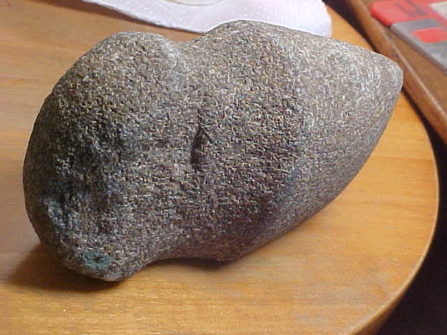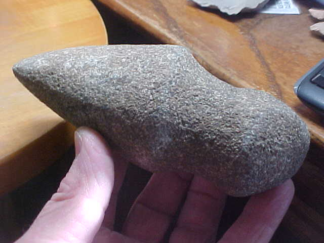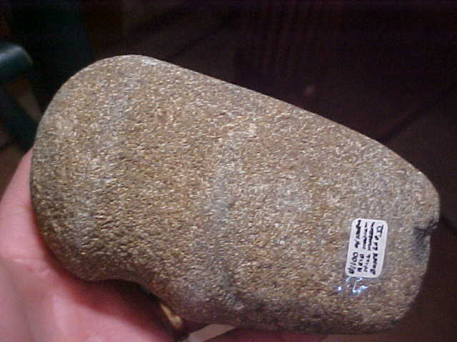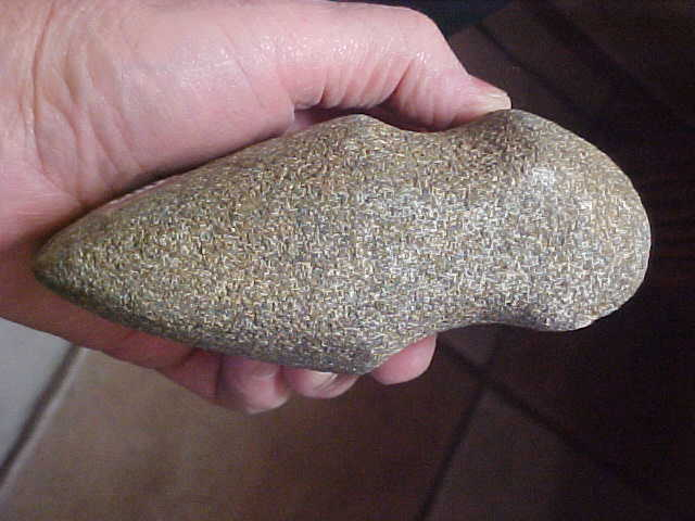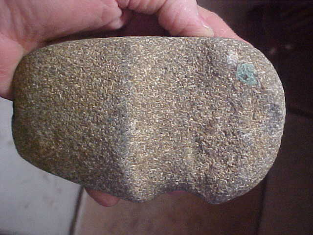 A little squeezing, a little bulge of the box sides, the Mid Archaic AXe will fit a $13.00 Priority Mailer, so you know what the shipping will cost. The piece is from the Indian Hill Museum collection of Norman Reid, an axe I put in my collection since the collection was sold in the estate sale--nice axe, better made 3/4 groove than I ever found, but then Mr. Reid was surface hunting plowed (actually plowed) fields back in the early 1950s. He didn't mark tis one but the majority of the finds he made were Edwards County, Illinois. Made of a dense granite, 5&7/16" by 3&3/16". On the front 'ring' my caliper reads 2&5/16". The heel shows the shape of the starting Wabash River cobble--there wasn't quite enough stone there to fashion a rear groove ridge--not a break, simply a sculptor who ran out of stone Also on the heel is a splotch of green paint--your guess is as good as mine as to what that's doing there. The surface shows a couple light plow scratches and then that bit ding--looks like a farm plow barely caught the bit, it flaked-away a small spot. Being so large it's surprising that was all the damage done to the 6500BP axe. I welcome checks or M.O>s, but please note I do not use paypal--Roy A.