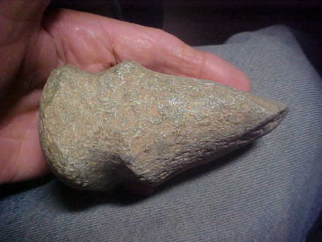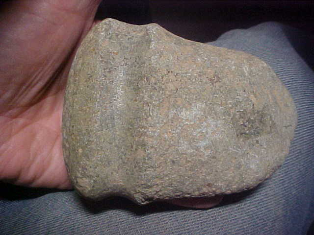 Priority mail to ship the piece, $13.00--USPS rates are a bear--sorry about that. The Mid Archaic-type axe, 6500 (or so) BP, three-quarter grooved and made of a dense Greenstone--pick it up, you'll understand, it's heavy. The finder hunted Wabash and Edwards Counties, S.E. Illinois--the auctioneer of the estate knew the creek that the man used to hunt, so that'll be part of the provenance sent along with the piece. Length is 4&1/8", height is 3&3/16", and right on 2" thickness on the heel. The bit shows the axe went through a number of use-repair cycles, a ding to the bit that was reground, a ding that wasn't repaired by regrinding. The easiest way I can say that is that the tool saw a lot of use. A 'scuff mark' shows on one side but no obvious plow scratches--the area of the best polish is in the groove itself--they really ground that groove to a high polish. This piece is real, period. I welcome checks, money orders, or cash, but do not use paypal--Roy A.