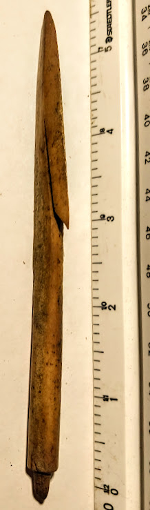 This Eskimo Bone Deer Arrow was found on St. Lawrence Island, Alaska. "Deer Arrow" is a name given to this type artifact (See Overstreet). It is made from antler and is trilateral with a notched point at one end and a rounded tang at the other.