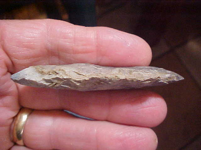 Slightly over 2&3/4" by 1&3/16", a heavy (strong) blade at 3/8" thickness--that larger percussion-type chipping, you have little doubt the piece is Late Archaic in origin--they made points with a thicker medial ridge, percussion chipping, and lack of basal edge grinding. If I type the piece as any particular style, Cypress Creek is my first line of study. Although the point is much later in time (2500--3500 BP, the basic outline reminds you of the much earlier Hardin points. AS far as the flint--a "local deposit" would be the only suggestion I'd have, it isn't a flint that was in heavy use in southwest Indiana, where the piece has been in a local collection--authentic in every detail. Shipping is $8.00, checks, cash, or M.O>s welcomed. Sorry, I do not use paypal--Roy A.
