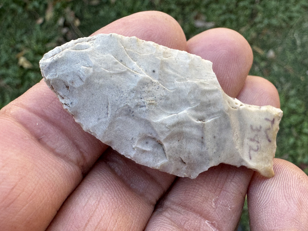 Recovered in Travis county, this has the heavy right-hand bevels at the base typical for the Nolan Projectile point. It shows heavy use wear with a white tip. It is thin with superior flaking and comes with a Bill German COA. I have the shipping.