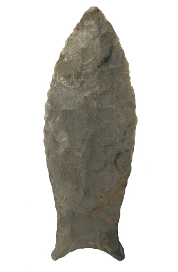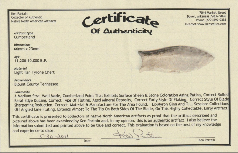 This rare Cumberland is made from striped Tyrone chert. It was found in Blount county Tennessee. Nice form with long flutes.