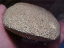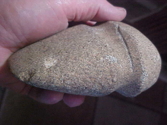 Edwards County, Illinois, a grooved axe style that's not a full groove or a three-quarter groove, "late portion of the Early archaic Period" is how I'd describe the time slot. The top of the Axe isn't flat as are the Mid Archaic Axes, but yet does have slight grooving that was the 'accepted method' for the 'height' of the 7500BP Early Archaic. Styles were changing--does that work? Made of a granite with phenocrysts--quartz inclusions-- the big axe measures an almost exact 5" by 3&7/8"--caliper reads 2&1/4" max thickness on the very heel. That the axe was a field find is of no doubt, some farming-made scratches--not terrible, but they're there in places--they're also part of the history of the piece: big stone gets rolled by plowing, simply said. Every detail is guaranteed authentic. Shipping is $13.00, the axe will BARELY fit in a Priority Mail package. I welcome checks or M.O>s, but do not use paypal--Roy A.