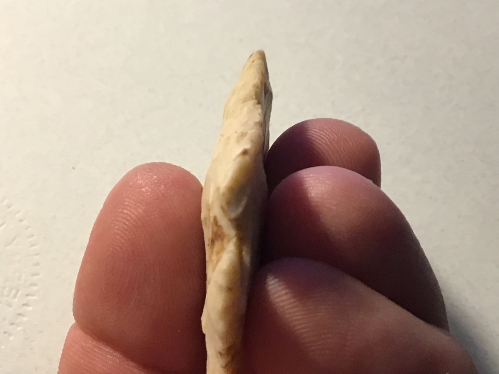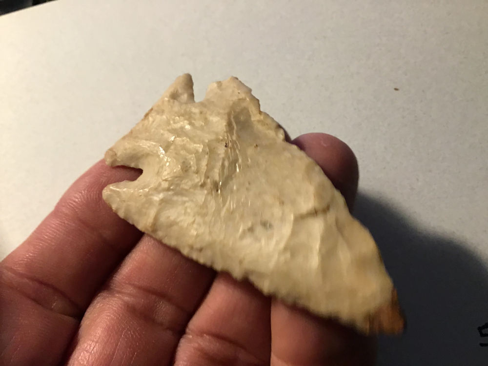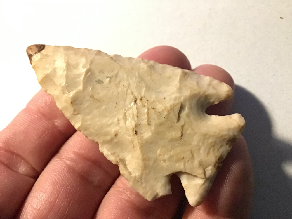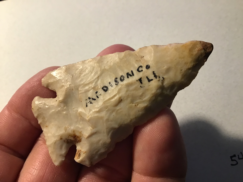 Recovered in Madison County, IL, this Archaic Kirk Corner Notched Point has a restored tip and a barb that has an ancient nick, but still a nice artifact. Finder is on the Jerry Dickey COA. I have the shipping.
