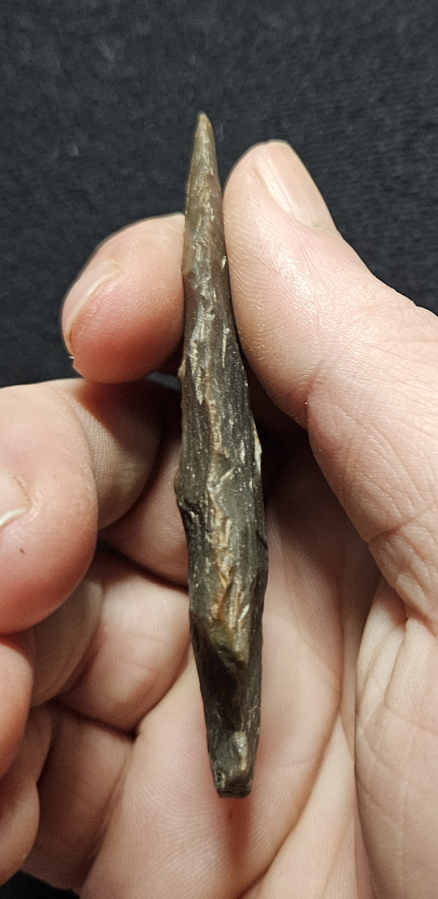 Very nice Buck Creek from Menifee Co, Kentucky. Excellent workmanship on a stunning colorful piece of breathitt chert with red swirls. It has some ancient damage but was still hafted and used. Measures 2 3/4 inches long. Great point out of a piece of sought after material. Make it yours today!