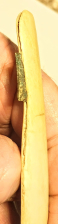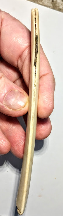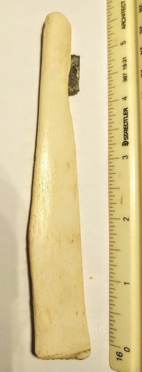 This artifact is a polished deer rib that has been converted into a hand scraper with the addition of a metal blade at one end. It is likely from the early-to-mid 1800s. It was found in Morton Co., North Dakota near the town of Mandan.
