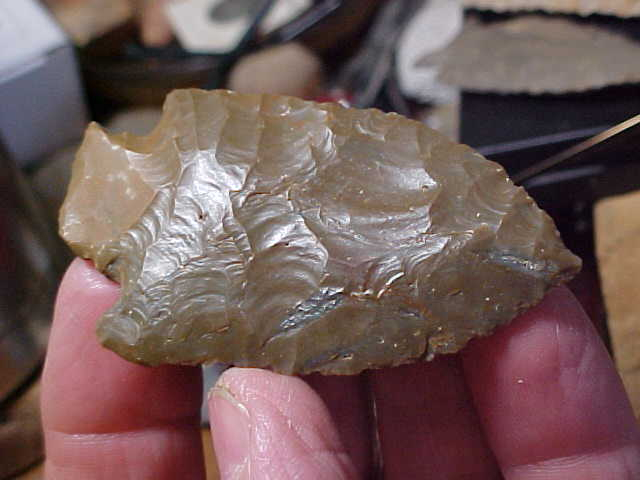 One of my favorite creek finds EVER, this Hardin dates from back somewhere around 2010 or 2012--Webster County, Kentucky, area, super patinated Hornstone, weathered by the creek-carried minerals (and sunlight) to a bronze color. Length is 2&11/16" by 1&1/2". Looking at the flat face it's not hard to figure out the Early Archaic flint knapper began with a large flat-sided flake, not a bifacial blade--the reverse has chipping from barb to tip and down the opposite blade edge--the center of the blade, even the stem they're smooth--or show the 'ripple' of the flint as it was shattered from a large Hornstone chunk. The front face is medial ridged, and the only flat plane is on the stem--see the close-ups if that's hard to follow. Every detail is guaranteed authentic, period. Shipping is $8.00 with checks or M.O.s welcomed. Sorry, I do not use paypal--Roy A.