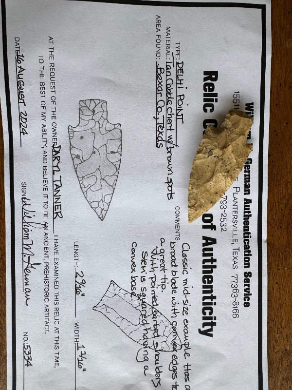 Recovered in Bexar County, this Delhi Point shows heavy use wear on the edges to a nice tip and heavy patina. There are several fossil inclusions. It comes with a Bill German coa. I have the shipping.