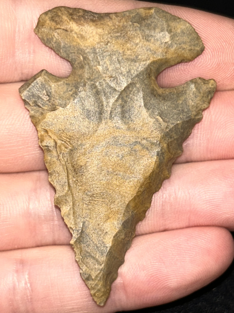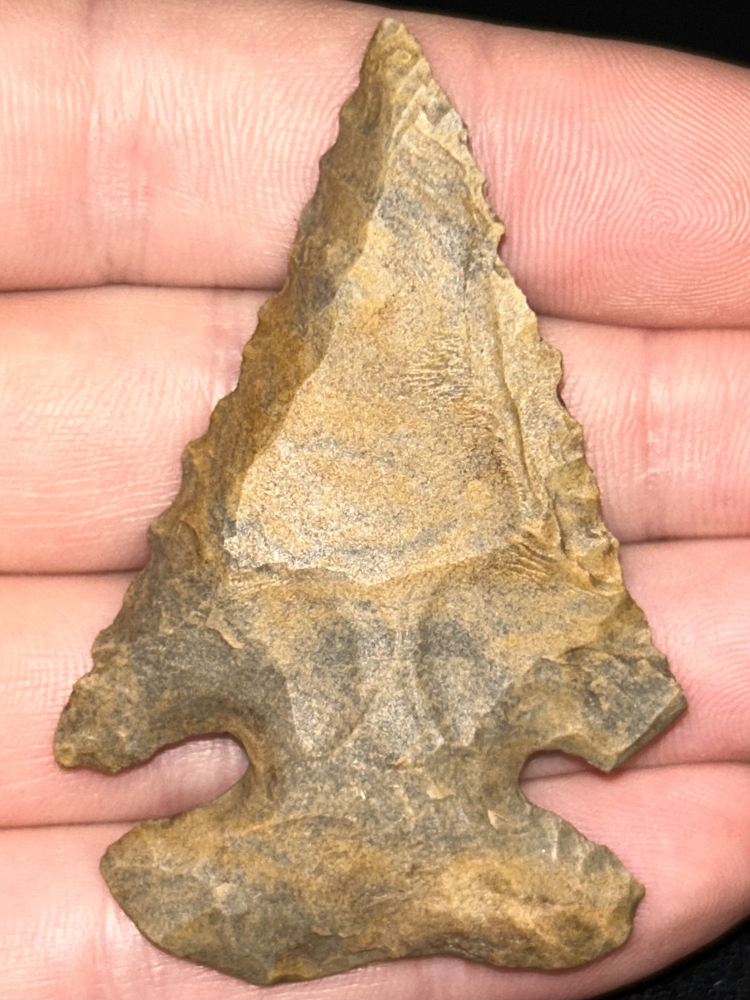 A fantastic Thebes found in Dubois County, Indiana. Made from beautifully creek stained Hornstone. Outstanding style and form with lightly serrated beveled edges and heavily ground base.