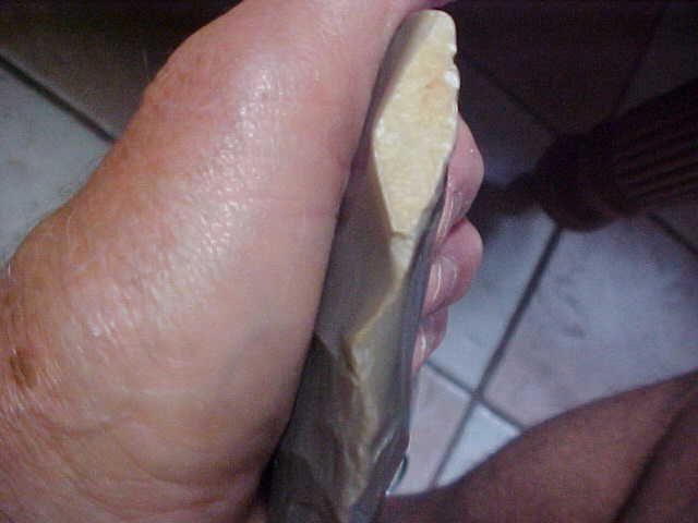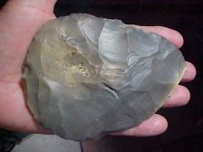Out of a S.W. Indiana collection, but not marked if it was part of the famous Spencer County, Indiana, "Crib Mound Cache" (somewhere between 10,000 and 14,000 blades found together, depending on which source you read)--the blade shape, the mineral adhesions on one face, the piece was very likely part of that enormous Cache, This one ended up in a Gibson County, Indiana, collection, but in fairness there are likely Crib Mound blades in all fifty states by now, plus foreign countries. The blades themselves are assumed to be Adena Culture. This one measures a full 5&3/16" by 4&3/4", max thickness of 13/16"--considerably larger than most of the Cache Blades (you can find pictures either online of it Art Gerber's book on Crib Site). The piece is an extremely good grade of Harrison county-type Hornstone, it shows a bit of a glossy white cortex near the tip--the flat-edged inclusion is almost a white chalcedony-grade material.. The blade is absolutely guaranteed authentic, period. Shipping is $10 due to the weight. Checks are welcomed, money orders as well, but I do not use paypal--Roy A.