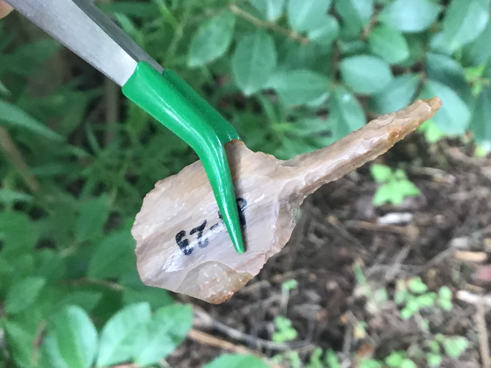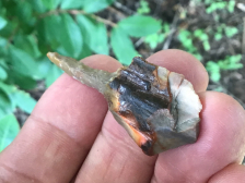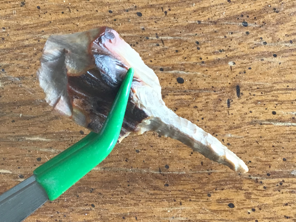 Made of quality Petrified wood with cortex polish on one side. The bit is in great shape, unfortunately there is a pick ding on one side of the base. I have the shipping and will guarantee authenticity and satisfaction.