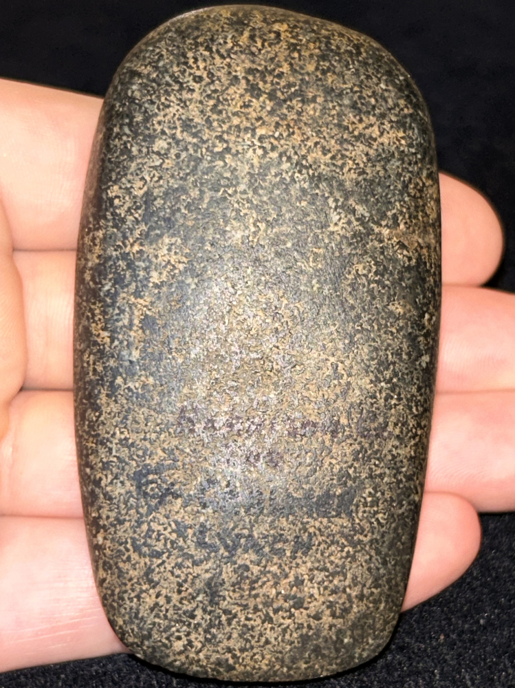 An outstanding Celt found in Harrison County, Indiana. Made from highly polished dark colored hardstone. Well crafted and in great condition with an excellent bit. Ex: Chalmer Lynch.