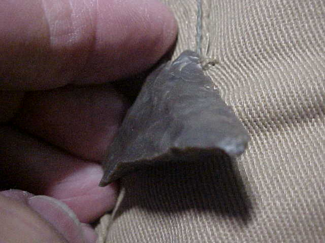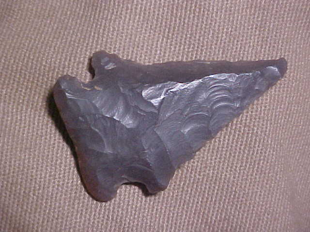 A "Tweener', elements of Lost Lake (steep bevels and extremely heavy basal edge grinding) and Hardin (very short base, barbs-to-basal corners, and barbs that are parallel to the basal corners, not 45o down-cast barbs. The pressure chipping (VERY high end workmanship) is clearly Early Archaic, 7500BO knapping. We can debate the 'classification' to slot the Spencer County, Indiana, point, but patination of the glossy hornstone is unmistakable--lifetime (mine) guaranteed authentic. Length is 1&13/16", and may have reached 1&7/8" if not for a tiny flat spot on the very tip. Width is 1&3/16", with 5/16" thickness. The thickness is very proportional, and indicates (as does the beveling) that the blade was considerably longer as first made. Nice point, real. Shipping is $8.00, checks or M.O.s are welcomed. Sorry, I do not use paypal or other payment services--Roy A.
