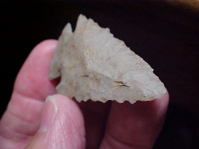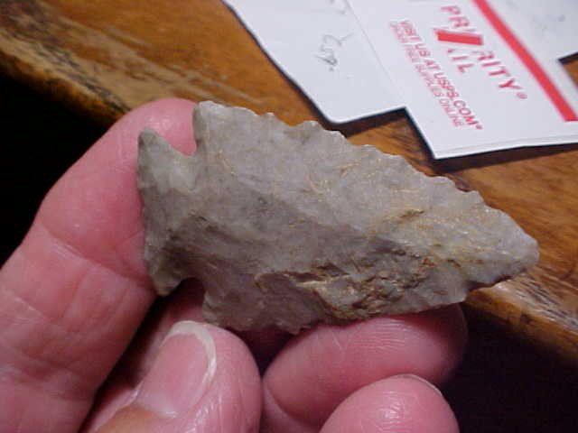 Start off with shipping--included with the price, no additional costs on this Wayne County, Indiana, Early Archaic point--HEAVY bevel, heavy basal edge grinding, so you know it's not a Kirk or Pinetree, first of those doesn't have the heavy basal grinding, the Pinetree doesn't use bevel sharpening. So, that leaves you at Dovetails and/ or Lost Lakes. If a Lost Lake classification you'd think the barbs would be longer, the base not quite as rounded. Admittedly, there were multiple sharpenings of the blade, so there could have been more length to the barbs as first made--somehow, though, they still look too 'stubby', too 'cast out' for a Lost Lake. Where does that leave you: Dovetail...but with some Lost Lake 'influences'. One thing I'm pretty certain of is that the flint is a form of Attica (Indiana Green), not quite to 2&1/16" by 1&3/16", with a max thickness slightly over 1/4"--GOOD symmetry. Look at the point under a 10x loop and the patina literally raises your level of appreciation for the piece; guaranteed authentic in every detail. I welcome checks & money orders, but do not take electronic payments (like paypal)-Roy A.
