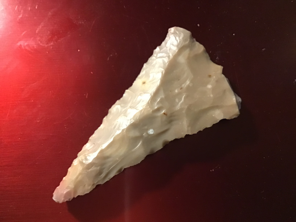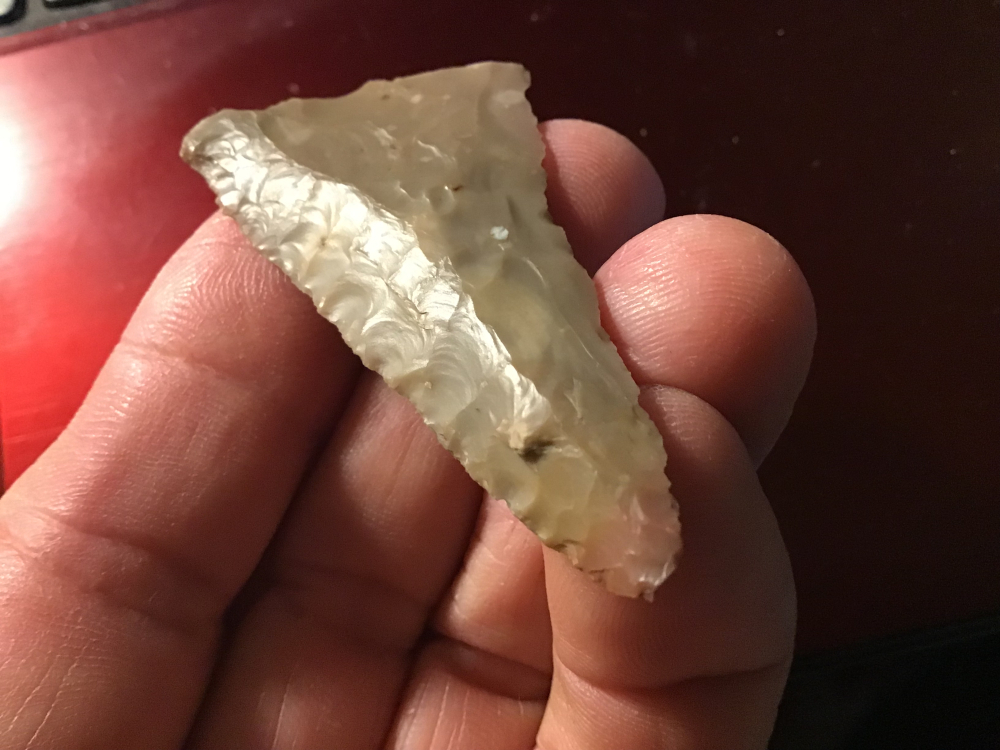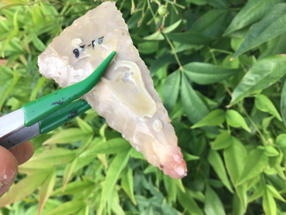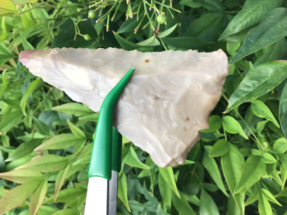 Very pretty ET with a steep right and bevel. Like many De Leon type ET's it does have an ancient nick on the left hand corner. It is thin and well flaked but does have a dab of glue on one side that will come off with an overnight soak.